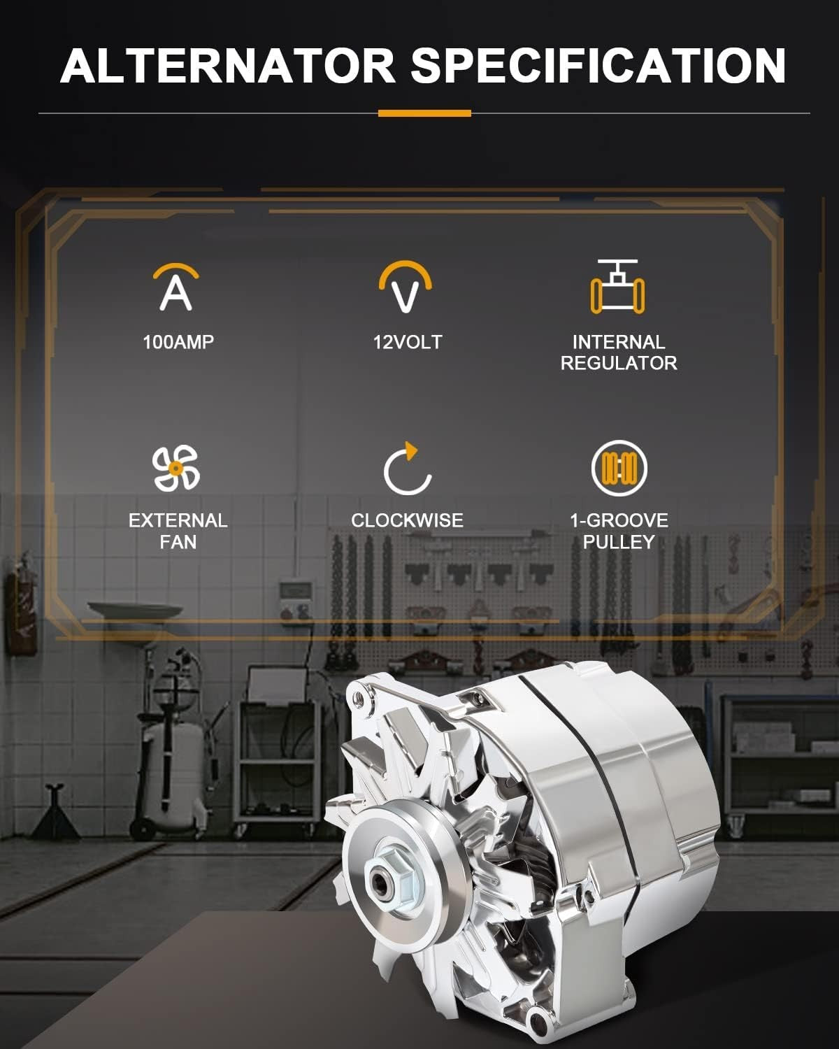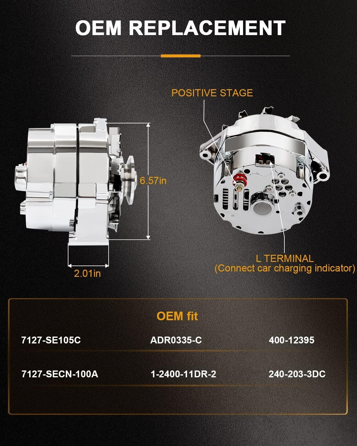 ROADFAR New Alternator High Output 100 AMP Chrome 1 Wire Replacement for Self Exciting Street Rod GM 305 350 BBC SBC 12V CW IR/EF 1100125 ADR0335-C 40012395 7127-SE105C 7127SECN100A