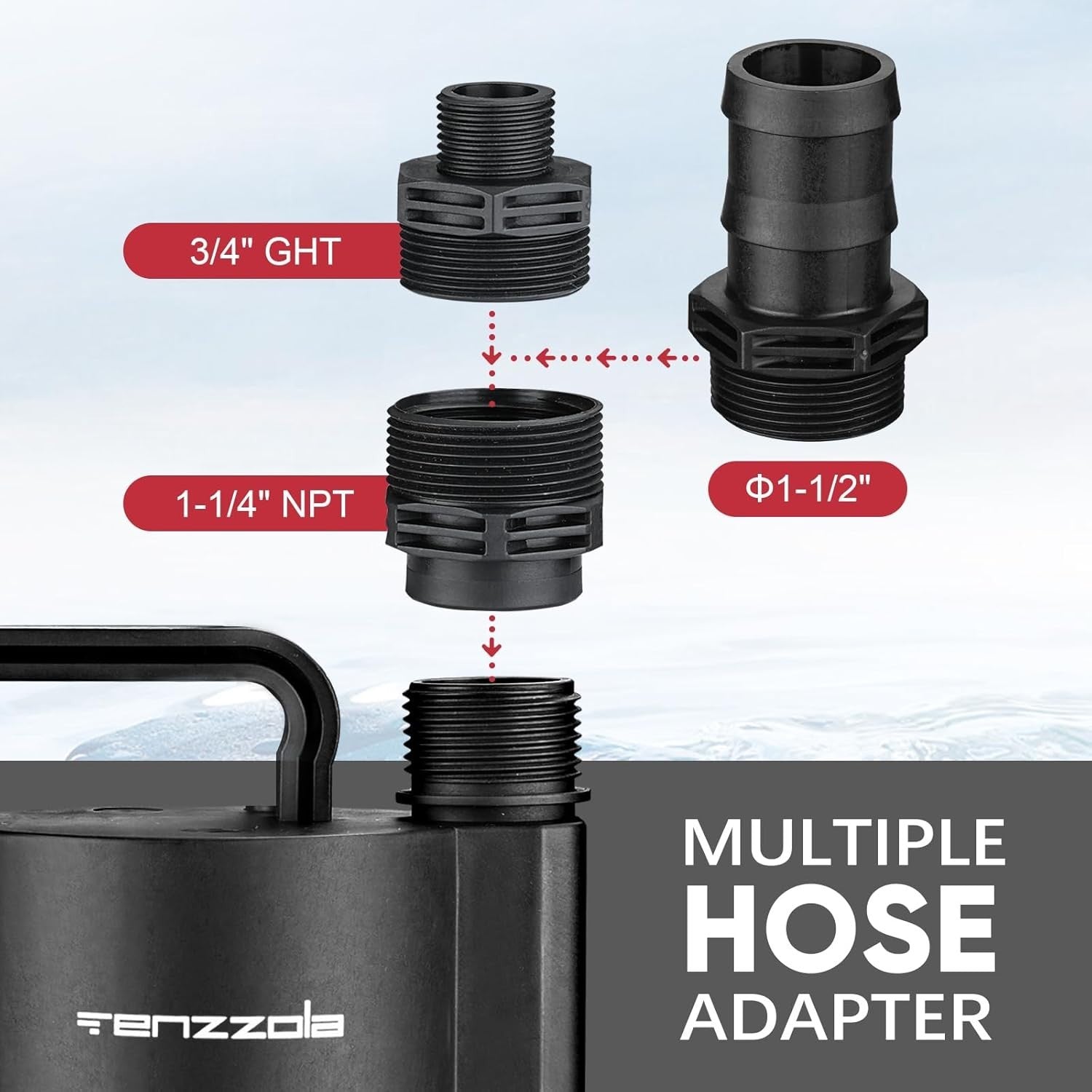 - Easy to Use: This submersible pump features a 1" discharge and includes a multi-use hose adapter compatible with 3/4" GHT, 1-1/4" NPT, and 1-1/2" barbed fittings for versatile connections. The pump efficiently operates until the water level drops below 1/5 inch.