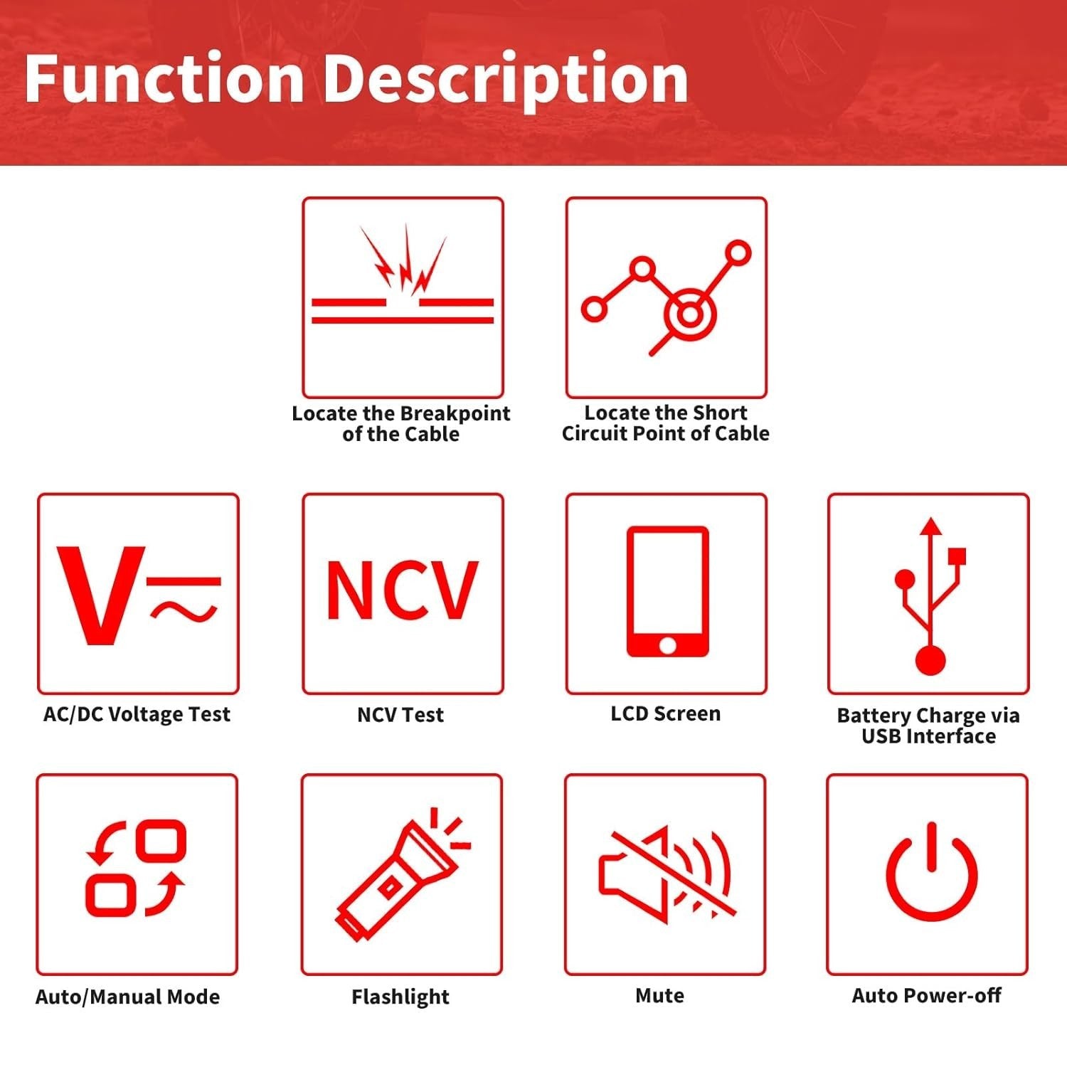 - Functions: The underground cable locator is designed to detect cables, electrical lines buried in walls or underground, as well as fuses and current circuits. It can also detect interruptions and short-circuits in cables and wires. Note: The black cable needs to be connected to a ground plug for grounding when detecting a breakpoint. When testing multi-core cables, the other cores must be grounded together.